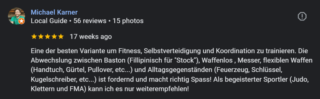 Hören Sie direkt von unseren Mitgliedern und erfahren Sie, wie das Training im Eskrima Fight Club Leoben ihr Leben positiv verändert hat. Unsere Kampfsportkurse und das einzigartige Trainingsumfeld haben nicht nur ihre Selbstverteidigungskompetenz gestärkt, sondern auch ihr Selbstvertrauen und ihre Resilienz verbessert. Lesen Sie die Erfahrungsberichte und finden Sie heraus, warum unser Eskrima-Training und die gemeinsame Atmosphäre so besonders sind. Jeder hat seine eigene Reise und Erfahrung – und wir freuen uns, wenn wir ein Teil davon sein dürfen.