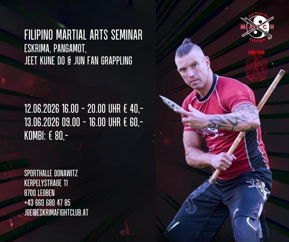 Im Juni 2026 veranstaltet der Eskrima Fight Club Leoben ein hochkarätiges Filipino Martial Arts Seminar mit dem international renommierten Instructor Master Marcel van Dongen aus den Niederlanden. Dieses Seminar richtet sich an alle Kampfsportler, die ihre Fähigkeiten in Eskrima, Pangamot, Jeet Kune Do und Jun Fan Grappling erweitern oder vertiefen möchten.